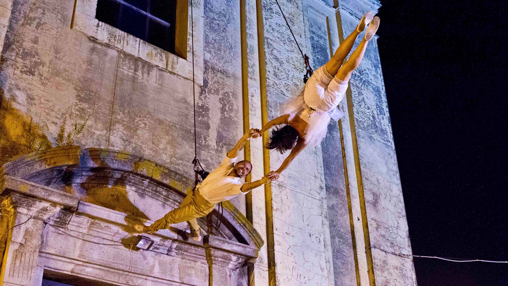 צמד אוהבים מרחפים באוויר, מעל עצים, מרפסות ובניינים! בסלטות פרועות על קירות, בתרגילי לוליינות, ובטנגו תלוי הם חוגגים את המשיכה כשהם קוראים תיגר על כוח המשיכה! לכל המשפחה.